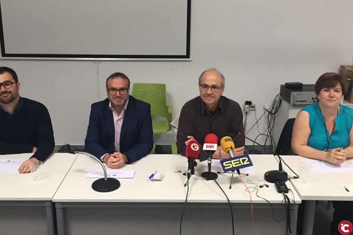 El alcalde de Villena, Francisco Javier Esquembre; el gerente de la Agencia Local de Alicante, Manuel Juan Amorós; la jefa de programas de Empleabilidad de Fundación Telefónica, Elena Ayuso; y el portavoz de la Fundación Santa María la Real, Jaime García; han clausurado hoy un encuentro entre las dos lanzaderas que operan actualmente en la provincia de Alicante.