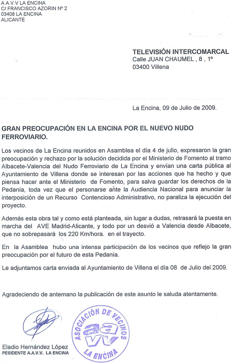 Comunicado del Presidente de la AA.VV. de La Encina, «Gran preocupación en La Encina por el nuevo nudo ferroviario».