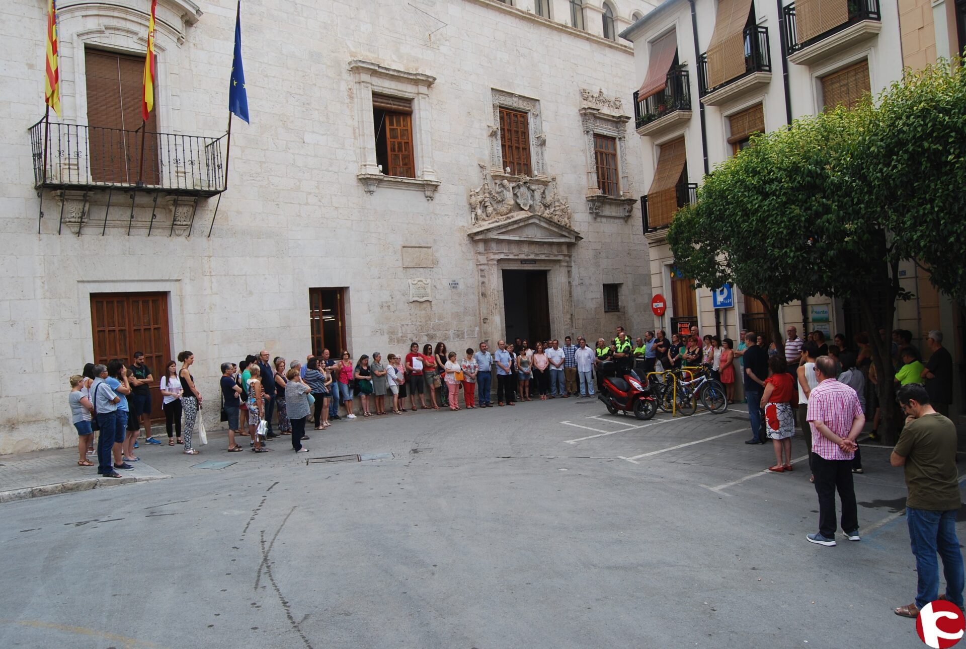 Concentración silenciosa de 5 minutos que ha tenido lugar a las 12:00 horas en la fachada del Ayuntamiento de Villena en la que han estado presentes miembros de la corporación municipal, técnicos municipales y ciudadanía en general que han querido sumarse a este gesto de repulsa contra el atentado terrorista sufrido en la noche de ayer en la ciudad francesa de Niza.