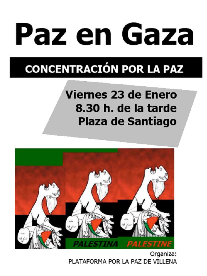 No podíamos más. Necesitamos manifestar nuestra queja por la barbarie que estamos viendo estos días por parte de Israel contra el pueblo Palestino. Varias decenas de entidades de la localidad (asociaciones, sindicatos, partidos políticos, ONGDs, grupos religiosos y diversos centros educativos de la localidad), bajo el paraguas PLATAFORMA POR LA PAZ DE VILLENA, convocan a toda la población de Villena y comarca, a una concentración con el lema PAZ EN GAZA. Tal y como se viene haciendo en otras ciudades de España y del planeta, necesitamos movilizarnos para condenar los ataques de Israel sobre Gaza, que en los últimos días han supuesto la muerte de más de 1.000 muertos y 5.000 heridos, la gran mayoría población civil. Deseamos presionar a los líderes políticos a la búsqueda comprometida y justa de la paz en estos territorios tan abrumadoramente castigados y masacrados por Israel, en la actualidad mediante brutal acción militar, y de manera prolongada a través de años mediante bloqueos económicos, colonizaciones, ausencia de respeto a los derechos humanos, e impedimento de la satisfacción de las necesidades más básicas, así como de las educativas y sanitarias.