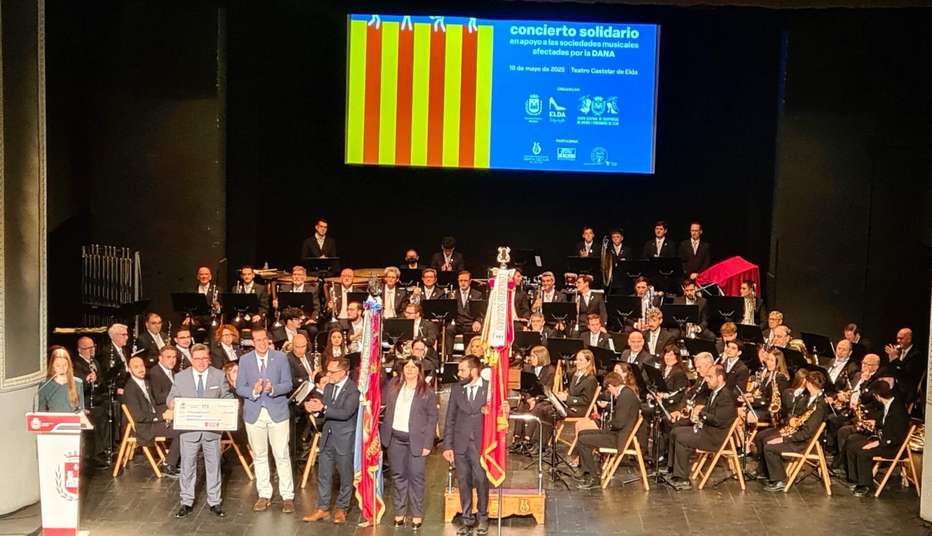 Al comienzo de la segunda parte se vivieron dos emotivos momentos, uno fue la imposición de corbatines en las banderas de ambas bandas como recuerdo imborrable de este acto de hermandad musical, un gesto simbólico que permanecerá en nuestras Sociedades como testimonio de la solidaridad vivida. Seguidamente se llevó a cabo el acto central más importante de la noche, la entrega oficial del cheque solidario a D. Ricardo Sales Ballester vicepresidente de la Federación de Sociedades Musicales de la Comunidad Valenciana, quien también nos honró con su presencia, de mano del alcalde de Elda y destinado a ayudar a las Bandas de Música afectadas por la DANA. Un momento especialmente significativo que simboliza el compromiso de las entidades organizadoras y del colectivo musical.
