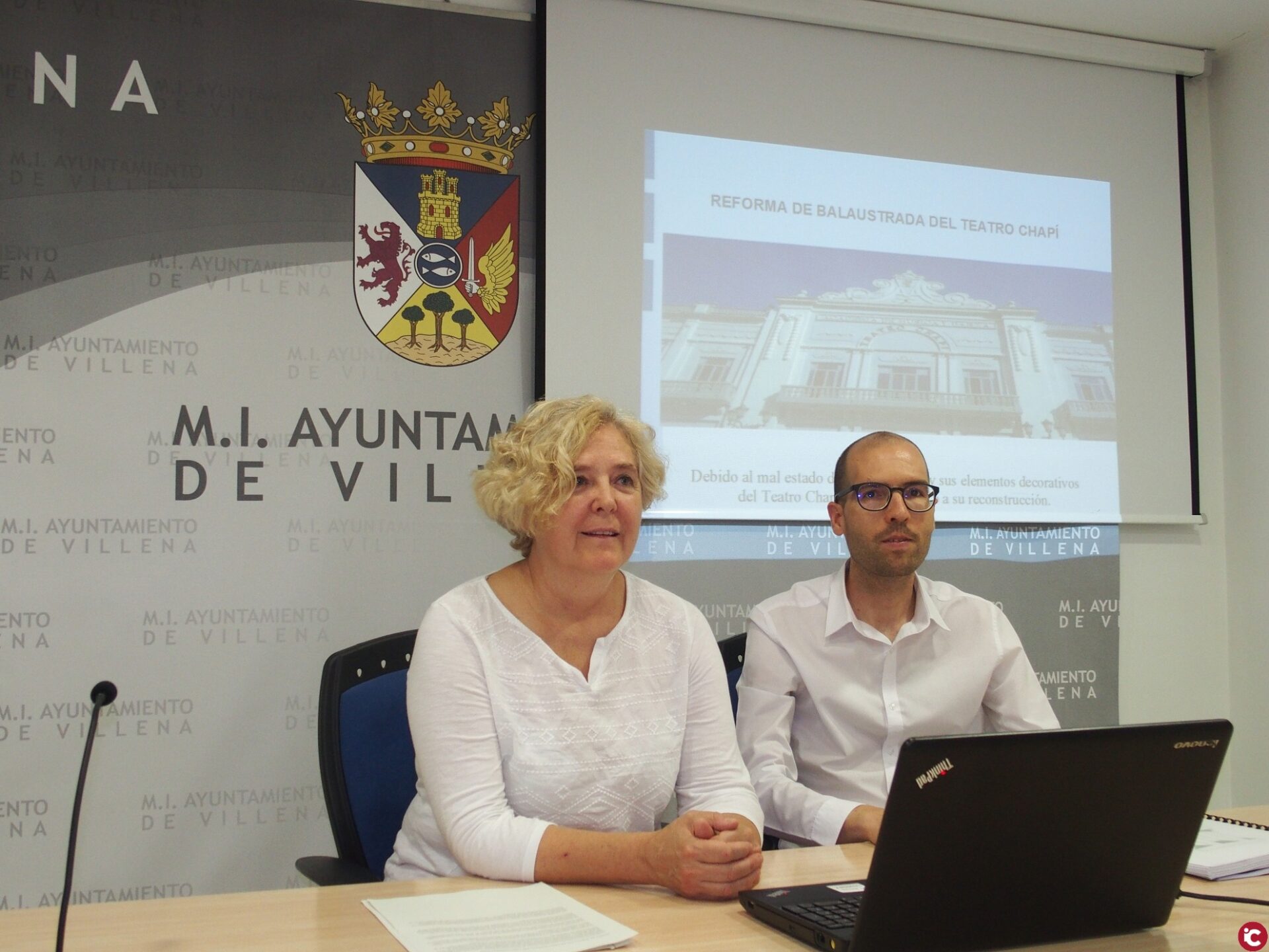 Cate Hernández, Concejala de Urbanismo, y José M.ª Martínez, arquitecto, redactor y Jefe de obra de la reforma del Teatro Chapí, dan por finalizada la obra de reforma de la balaustrada del edificio anteriormente mencionado.