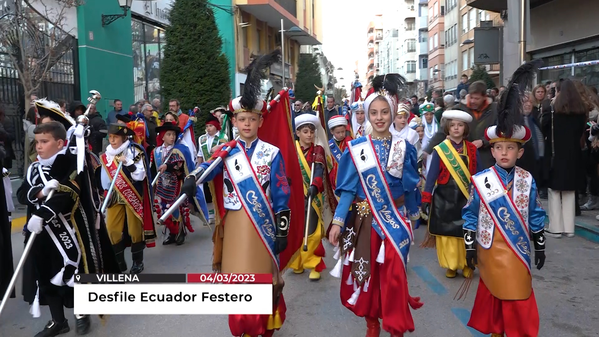 18:00 horas, Desfile del Ecuador Festero, que se inició en la Calle Nueva y recorrió las siguientes calles, Plaza del Rollo, calle Corredera, calle Joaquı́n Marı́a López, calle Ramón y Cajal y finalizará en la Plaza de Santiago. Participaron en el desfile, los Capitanes, Alféreces y Madrinas junto con sus homónimos infantiles, vestidos con el traje oficial de cada Comparsa, y las Regidoras 2023, que vistieron el traje de Villenera, acompañadas por la Laureada Banda Municipal de Música de Villena.