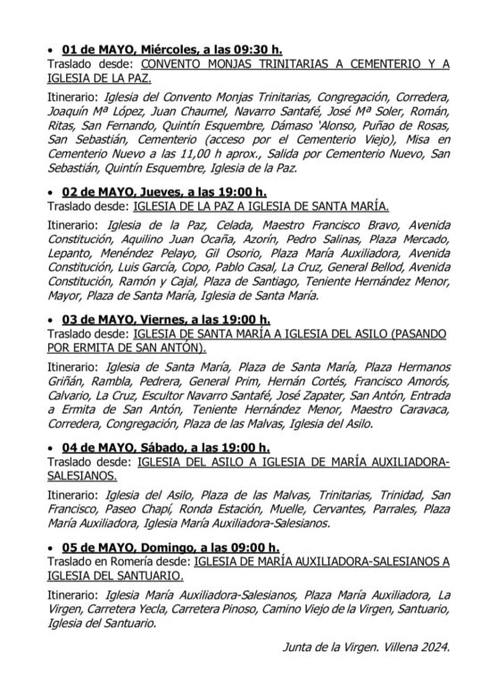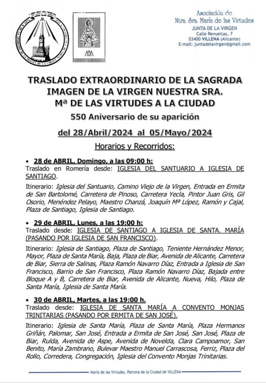 La Junta de la Virgen ha confirmado los horarios y recorridos que realizará Ntra. Sra. María de las Virtudes, Patrona de Villena, la próxima semana con motivo del Traslado Extraordinario a Villena por la celebración del 550 Aniversario de la Aparición en la Fuente del Chopo.