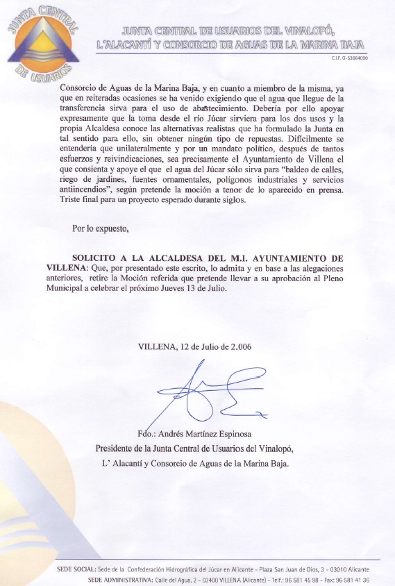 A LA SRA. ALCALDESA DEL M. I. AYUNTAMIENTO DE VILLENA.- ANDRES MARTINEZ ESPINOSA, mayor de edad, con D.N.I. 22.121.573-N, vecino de Villena, en nombre y representación, en su calidad de Presidente de la JUNTA CENTRAL DE USUARIOS DEL VINALOPO, LALACANTI Y CONSORCIO DE AGUAS DE LA MARINA BAJA, con domicilio en esta ciudad, calle del Agua 2, ante la Sra. Alcaldesa del M.I. Ayuntamiento de Villena comparece, y, dice: