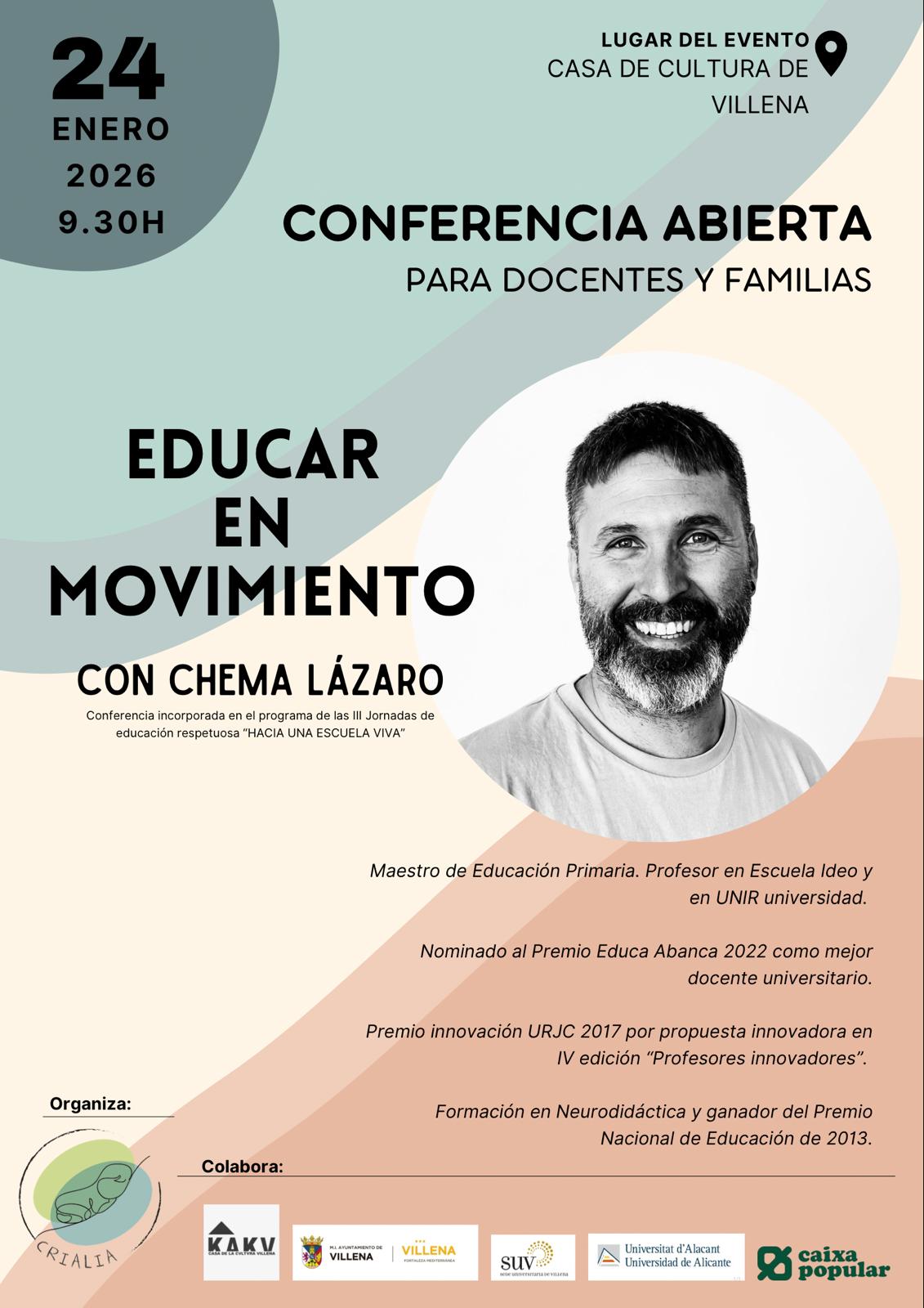 La conferencia inaugural, que cuenta con la colaboración de la Sede Universitaria de Villena, será impartida por Chema Lázaro, reconocido docente y formador especializado en innovación pedagógica. Durante su intervención, Lázaro abordará las bases neurobiológicas del aprendizaje, poniendo el foco en el papel fundamental que desempeña el movimiento en el desarrollo cognitivo y emocional del alumnado.