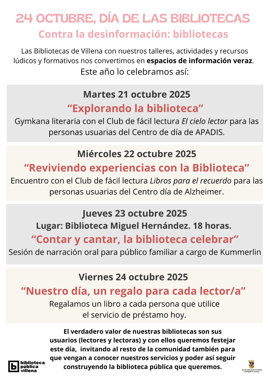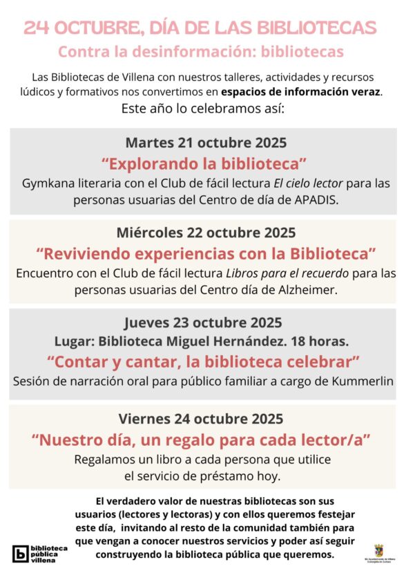 Las Bibliotecas Municipales de Villena celebran durante esta semana el Día de las Bibliotecas, una cita internacional que este año lleva por lema ‘Contra la desinformación, bibliotecas’, destacando el papel de estos espacios como guardianes de la información veraz y promotores del pensamiento crítico.