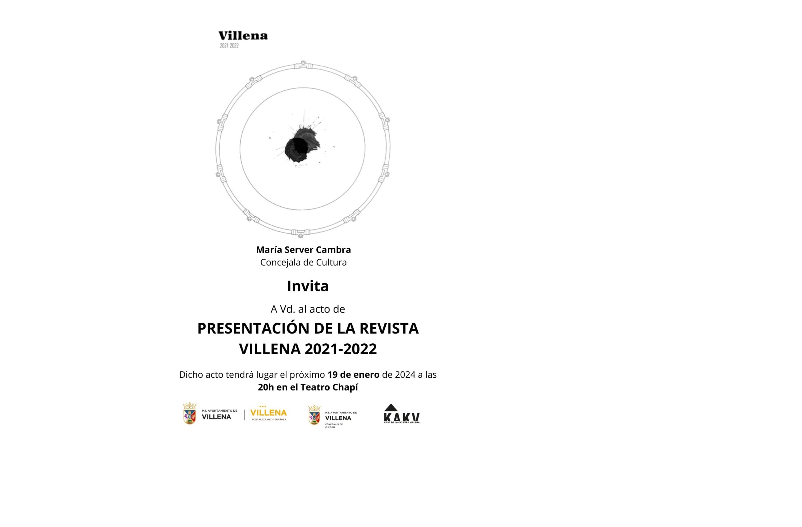 Villena, 18 de enero.-  La concejala de Cultura presentará la edición de la Revista Villena 2021-2022 este viernes, 19 de enero, a las 20.00 horas en el Teatro Chapí. Esta edición bianual recoge todas las colaboraciones de un gran número de vecinos y vecinas de Villena del periodo post pandemia Covid-19 que vivió la ciudad y que condicionó muchas de las actividades cotidianas públicas y privadas de Villena.