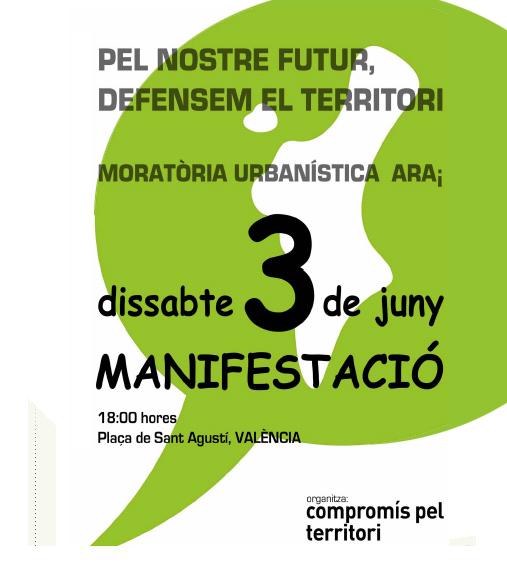 En este sentido también se abordará la repercusión de la manifestación del próximo sábado 3 de junio en Valencia organizada por el colectivo “Comprimís pel Territori” , la plataforma que aglutina a la mayoría de organizaciones ciudadanas contrarias a los abusos urbanísticos, y que se convoca bajo los lemas “Una moratoria urbanística, ahora. Gestión racional del agua. Una política social de la vivienda. No a la especulación, no a la corrupción”.