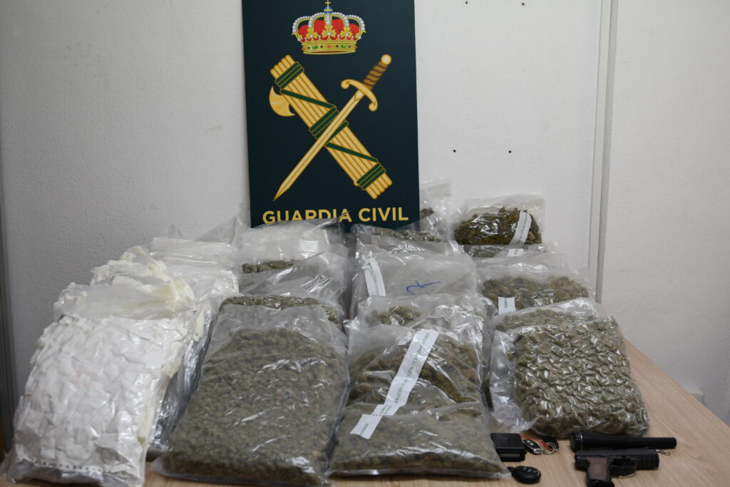 Finalmente, en la fase de explotación de la operación, los agentes del área de investigación, con el apoyo de la Unidad de Seguridad Ciudadana de Alicante (USECIC), los componentes del Equipo Territorial de Policía Judicial de Villena, el agente del Servicio Cinológico con su perro y los diferentes agentes de Seguridad Ciudadana de los Puestos de la Guardia Civil afectados, llevaron a cabo la detención de los cinco sospechosos en las localidades de Sax y Alicante. Además, se realizó un registro en un local de Sax y dos en domicilios de Sax y Alicante, donde se intervinieron 7.240 gramos de marihuana, empaquetado en 7 bolsas al vacío, herramientas para el envasado, un arma corta simulada, 8.940 euros en efectivo, así como diverso material informático y numerosos teléfonos móviles.