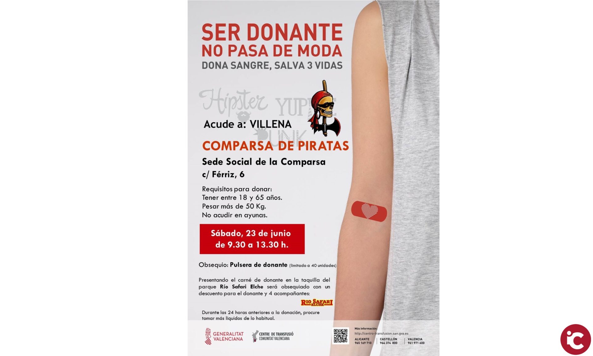 Una nueva cita tendrá lugar este próximo sábado 23 de junio, de 9.30 a 13:30 en la sede social de la Comparsa de Piratas, con la finalidad de promover la donación voluntaria de sangre en beneficio de la sociedad y en favor de Cruz Roja.