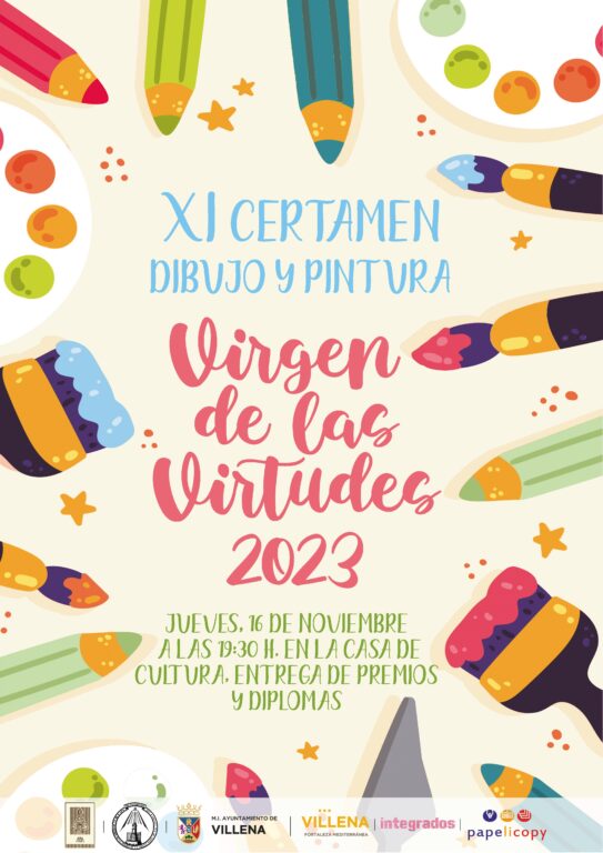 Dentro del grueso de actos anuales programados, hemos vuelto a organizar nuestro Certamen de dibujo y pintura “Virgen de las Virtudes”, que en esta ocasión cumple su decimoprimera edición. Un concurso que sigue contando con gran participación por parte de la comunidad escolar, donde colabora el MI Ayuntamiento de Villena y las empresas Integra2 y Papelycopy.