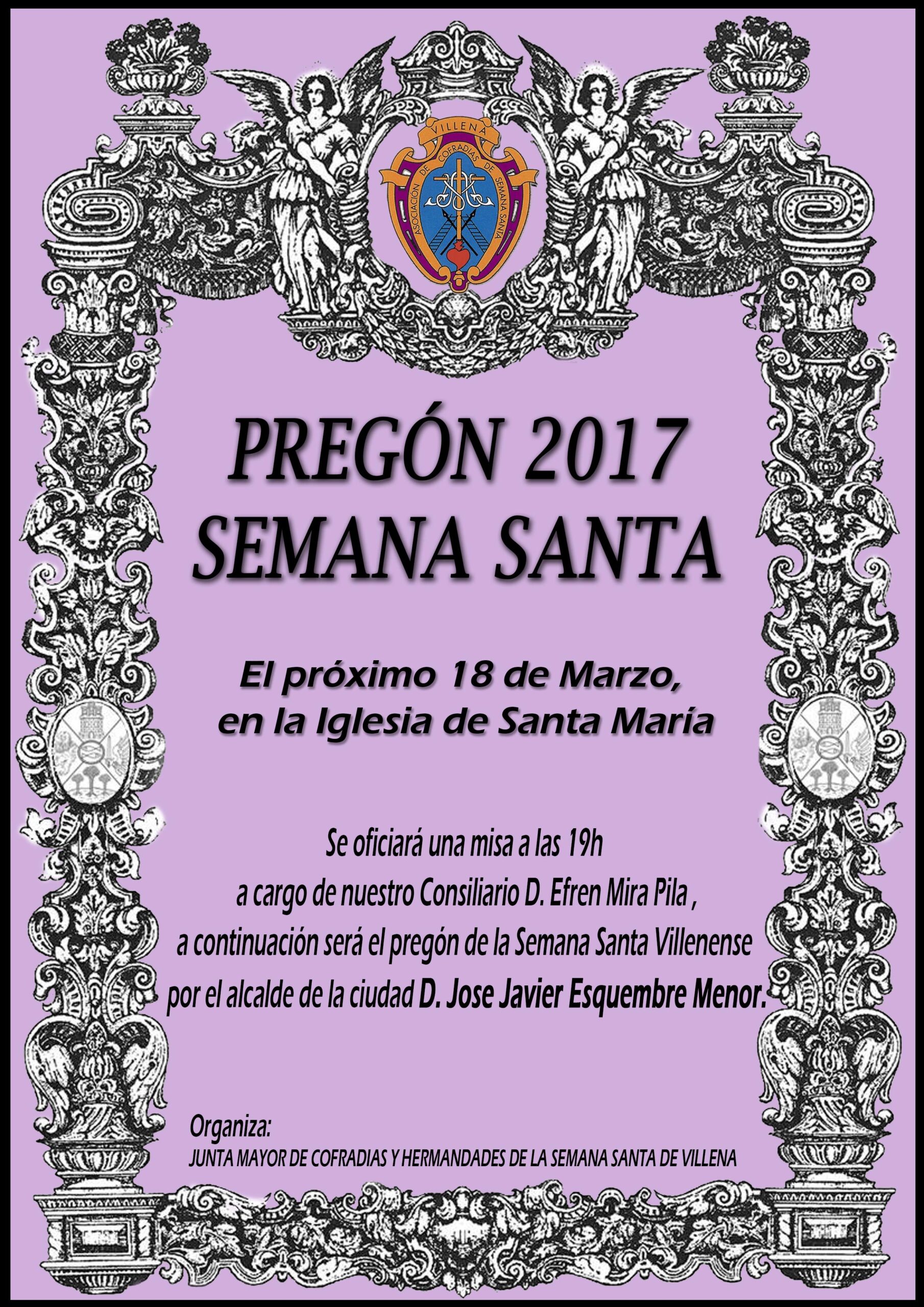Acto que da inicio a la Semana Santa de Villena, este año ha recaído el honor de ser pregonero en la persona de D. Francisco Javier Esquembre Menor, elegido por estar muy implicado en las necesidades culturales y tradicionales de nuestro pueblo.
