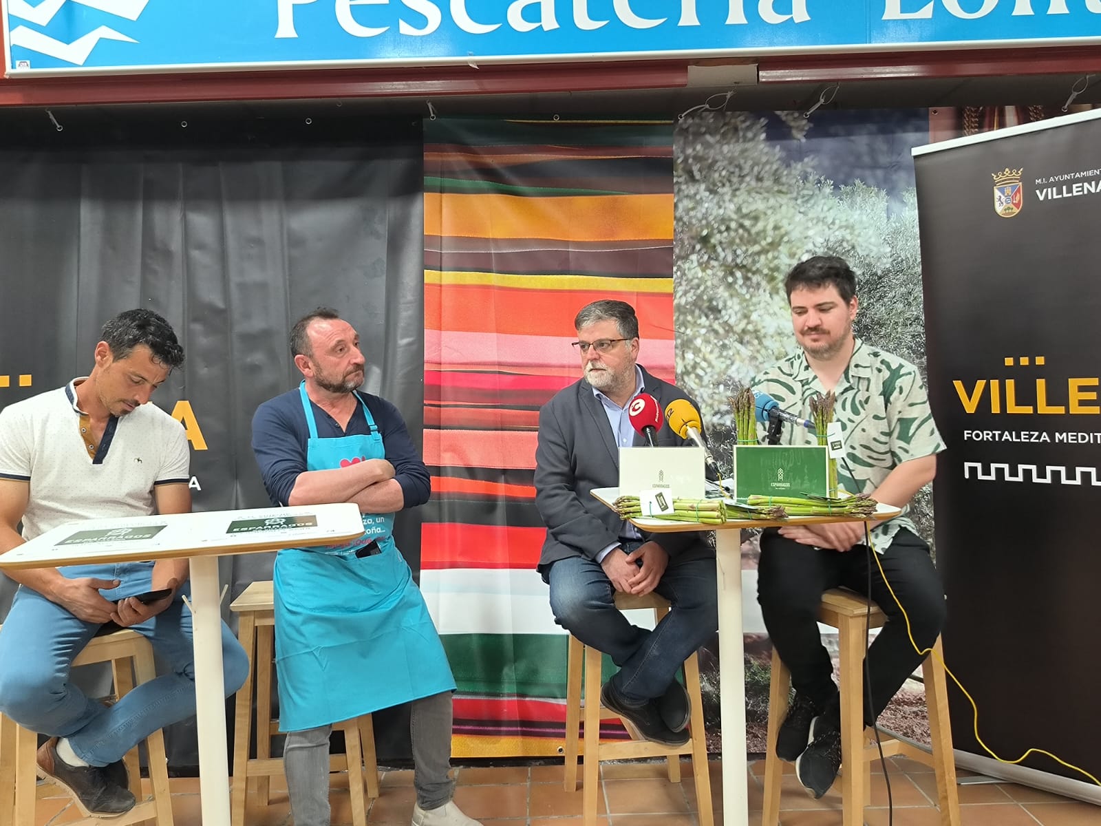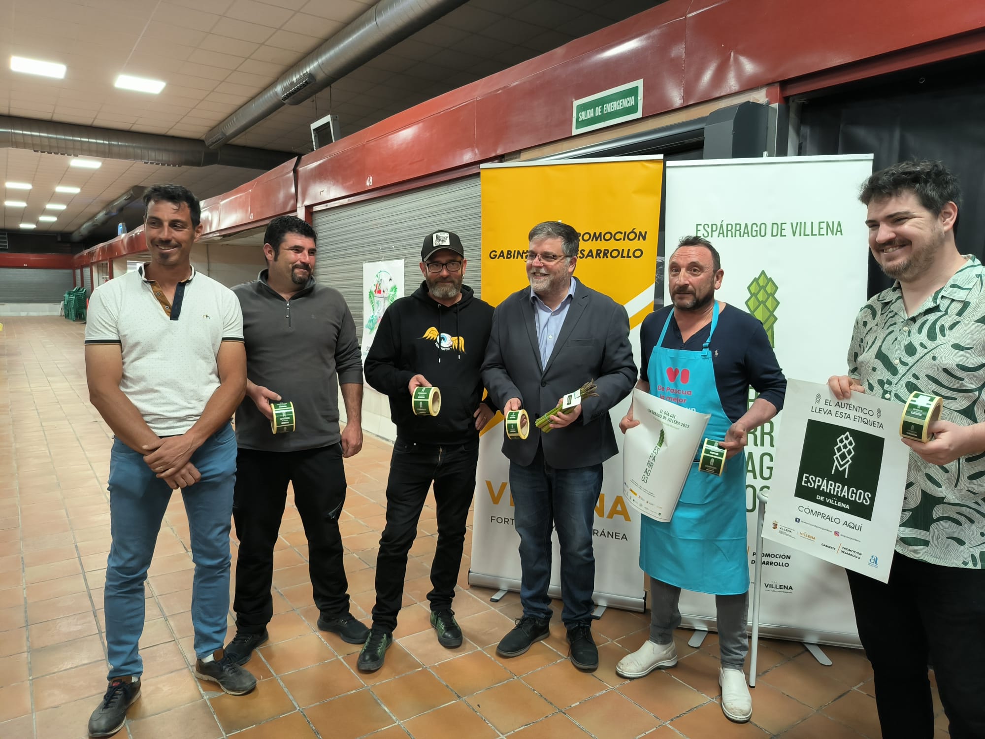 La delegación municipal visitó los establecimientos del Mercado Municipal que comercializan espárragos de la marca Villena e hizo entrega de los primeros manojos de estos ejemplares de la temporada, que se ha retrasado algo por las condiciones climatológicas.