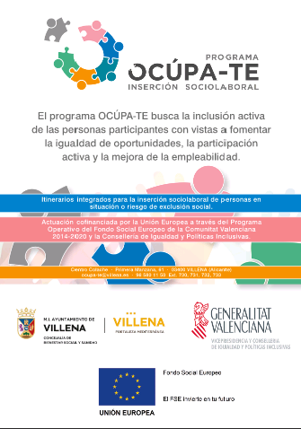 OCÚPA-TE es un programa municipal coordinado desde la Consellería de Bienestar Social y cofinanciado por la Vicepresidencia y Consellería de Igualdad y Políticas Inclusivas de la Generalitat Valenciana y el Fondo Social Europeo. La cantidad recibida es de 150 mil euros, de los cuales 105 mil serán invertidos en personal, y 45 mil euros se destinarán a pagar materiales y recursos necesarios para la realización del proyecto.