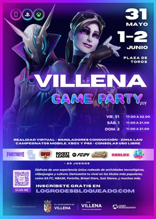 Villena celebrará su primera edición de ‘Game Party’, un gran evento que permitirá concentrar a jóvenes de todas las edades para disfrutar durante de un fin de semana de videojuegos de todas las modalidades y épocas, y competir en diferentes disciplinas ofertas en esta celebración multitudinaria tendrá lugar entre el 30 de mayo y el 2 de junio en la Plaza Multifuncional de Villena.