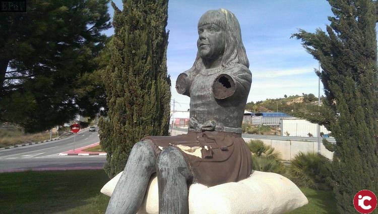 Hace unos años la escultura ubicada en la rotonda de entrada a Villena desde la carretera de Cañada fue víctima del vandalismo, y se cortaron los brazos de la niña que sujetaba un zapato en las manos, y algunos desperfectos más.