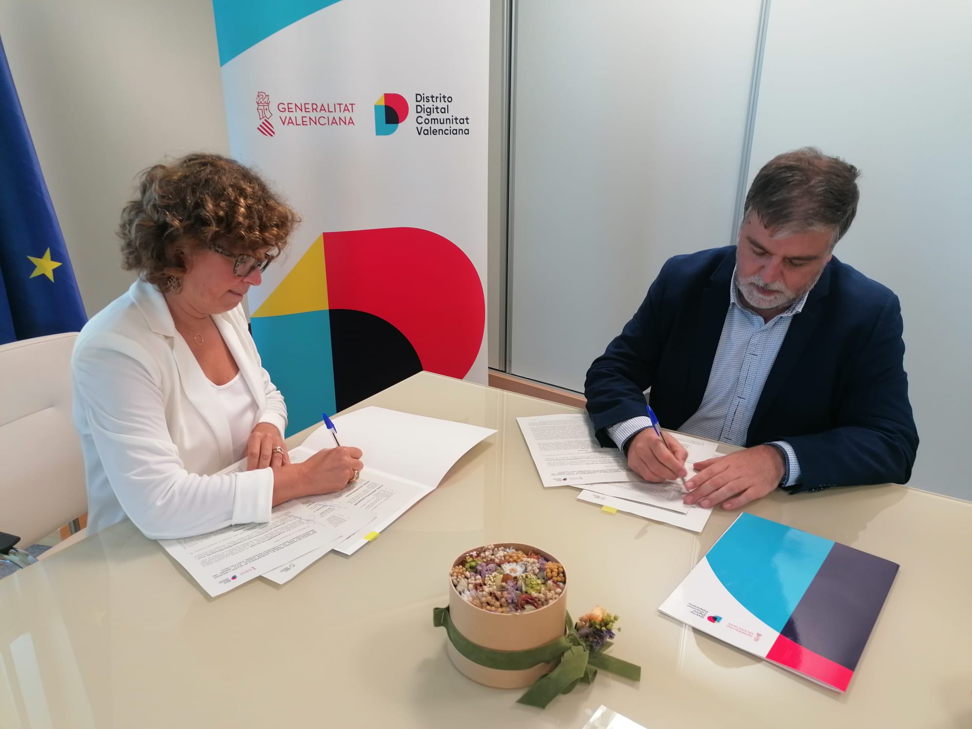Villena, 11 de octubre de 2022.- El alcalde de Villena, Fulgencio Cerdán, y la Consellera de Innovación, Universidades, Ciencia y Sociedad Digital, Josefina Bueno, han firmado hoy el Convenio de Adhesión a Distrito Digital que supone iniciar mecanismos de cooperación para el desarrollo de ecosistemas de innovación entre el tejido productivo local y la posibilidad de ubicar nuevas empresas con base tecnológica en Villena. Con este objetivo, el Convenio recoge acciones de promoción y orientación de las empresas villenenses a través del tejido empresarial ya ubicado en Distrito Digital.