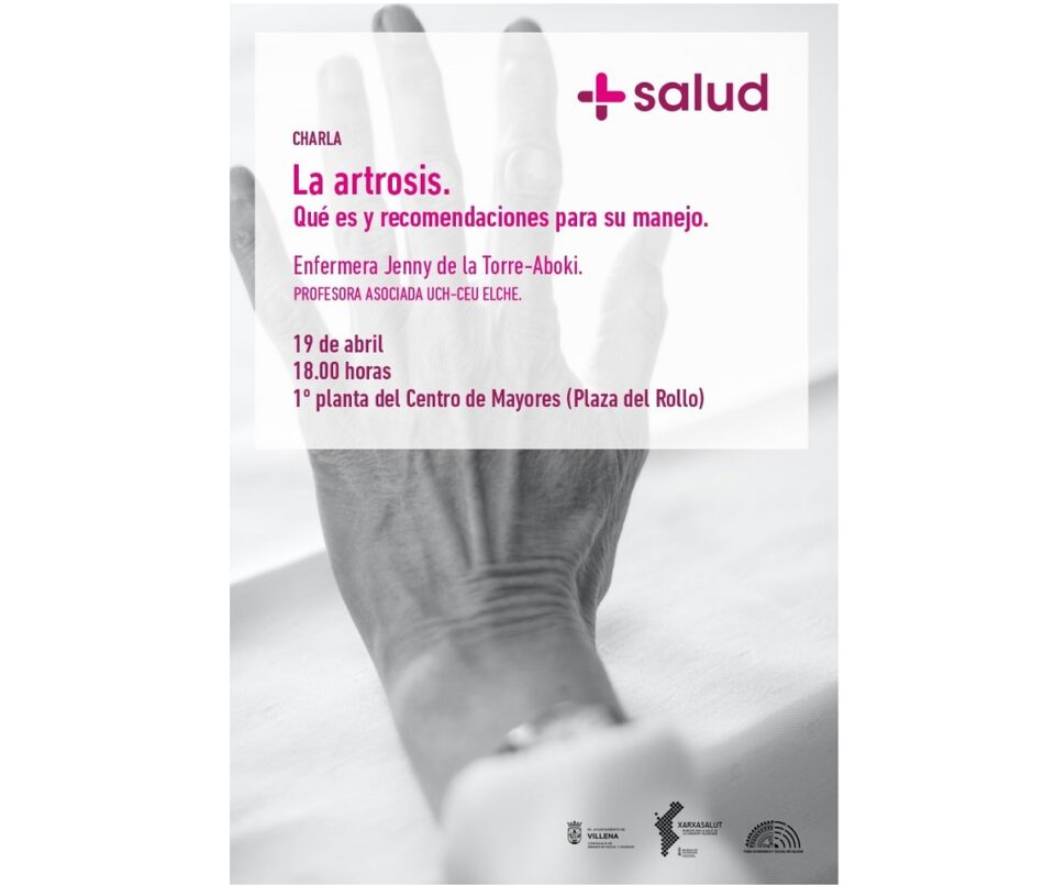‘La Artrosis. Qué es y recomendaciones para su manejo’ es el título de la nueva charla que se ofrece dentro del programa de conferencias ‘+salud’ de la Concejalía de Sanidad, que tendrá lugar el miércoles 19 de abril, a las 18.00 horas, en el Centro de Mayores de la Plaza del Rollo.
