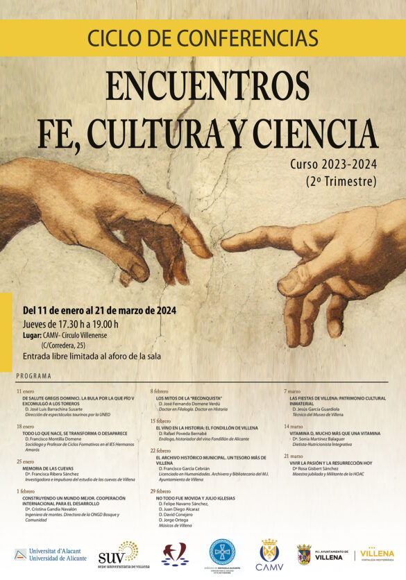 El trimestre del ciclo Encuentros se completa con una miscelánea de temas que arranca mañana jueves, 11 de enero, con la intervención de José Luis Barrachina, director de espectáculos taurinos, con su charla ‘De Salute Gregis Dominici. La bula por la que Pío V excomulgó a los toreros’. Continúa enero, con la intervención en el ciclo de Francisco Montilla, sociólogo y profesor del IES Hermanos Amorós, con su ponencia ‘Todo lo que nace, se transforma o desaparece’. Y cerrará el mes Francisca Ribera, investigadora de las cuevas de Villena, precisamente con una charla programada el día 25 sobre ‘La Memoria de las Cuevas’.
