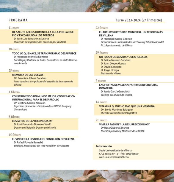 Febrero también contará con José Fernando Domene, doctor en Historia, que hará un repaso a “Los Mitos de la Reconquista’, que permita separar la realidad científica de la construcción de leyendas y mitos de un periodo determinante para la historia de España y de la ciudad de Villena.
