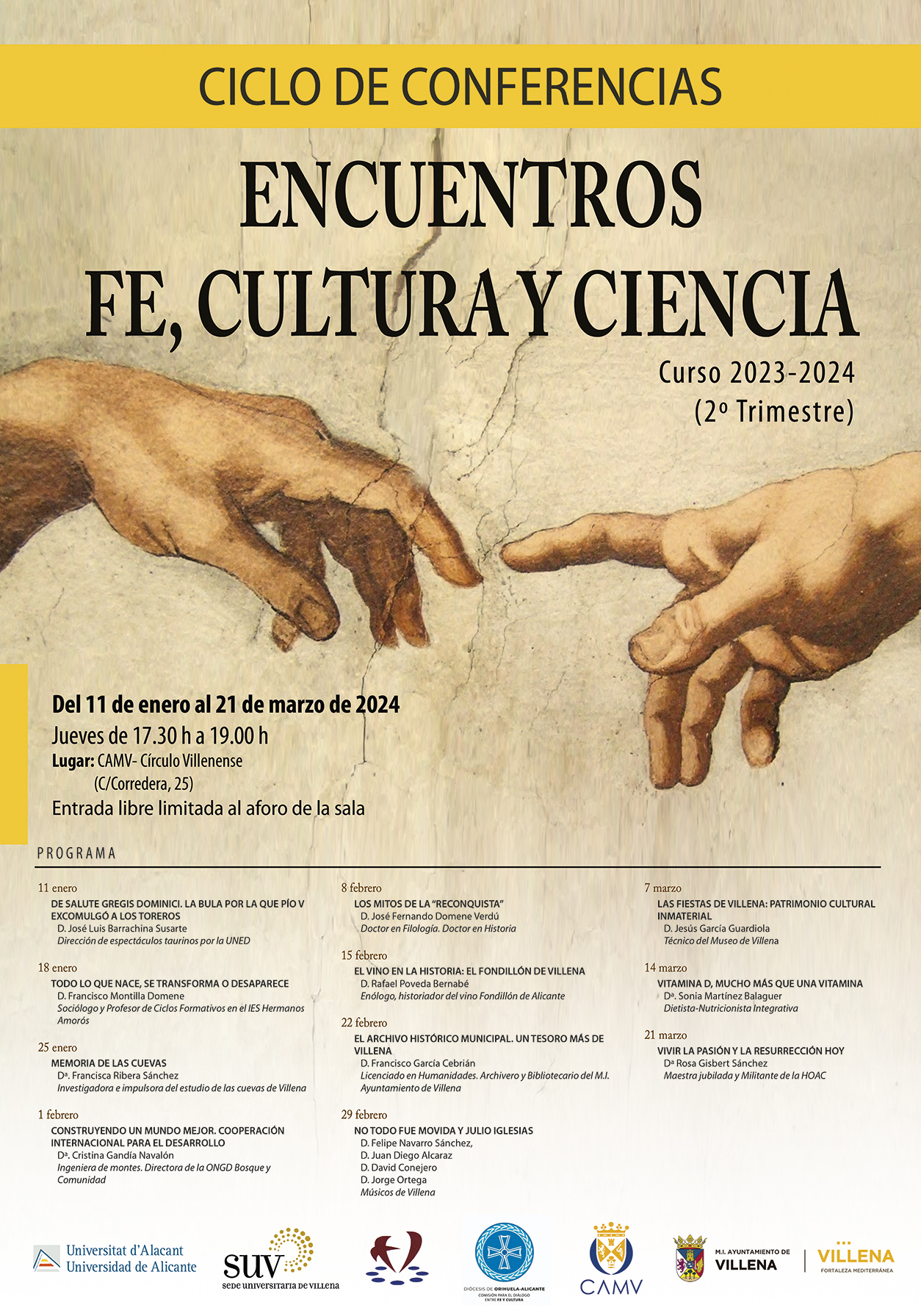 El trimestre del ciclo Encuentros se completa con una miscelánea de temas que arranca mañana jueves, 11 de enero, con la intervención de José Luis Barrachina, director de espectáculos taurinos, con su charla ‘De Salute Gregis Dominici. La bula por la que Pío V excomulgó a los toreros’. Continúa enero, con la intervención en el ciclo de Francisco Montilla, sociólogo y profesor del IES Hermanos Amorós, con su ponencia ‘Todo lo que nace, se transforma o desaparece’. Y cerrará el mes Francisca Ribera, investigadora de las cuevas de Villena, precisamente con una charla programada el día 25 sobre ‘La Memoria de las Cuevas’.