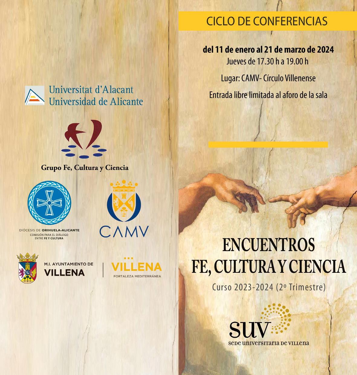 Villena, 10 de enero.- El primer trimestre del año de Encuentros Fe, Cultura y Ciencia centrará gran parte de su oferta en diferentes aspectos de la historia sociocultural de Villena, en un repaso a aspectos muy diversos que no suelen centrar los estudios históricos, según han comentado hoy la directora de la Sede Universitaria de la UA, Esther Perales, y el coordinador del ciclo, Ricardo Celiberti.
