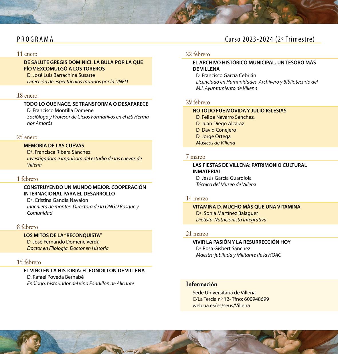 Marzo, y el ciclo de este trimestre se cierra con la participación de la nutricionista Sonia Martínez, ‘Vitamina D, mucho más que una vitamina’, el día 14; y ‘Vivir la Pasión y Resurrección Hoy’, de Rosa Gisbert, miembro de Hermandad Obrera de la Acción Católica (HOAC), que pone punto final a este trimestre el día 21.