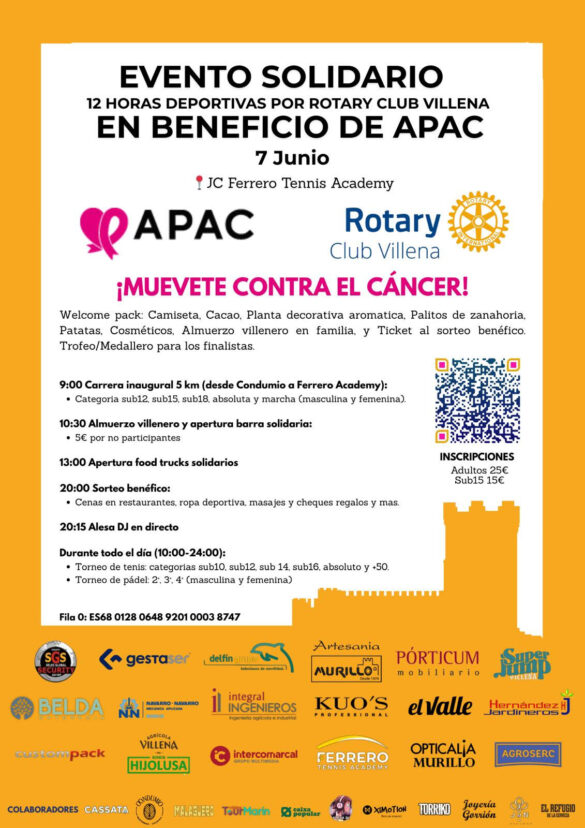 El próximo sábado 7 de junio, el Club Rotary Villena ha organizado un evento solidario en las instalaciones de la JC Ferrero Tennis Academy, con el objetivo de recaudar fondos para la Asociación de Personas Afectadas por Cáncer de Villena y Comarca (APAC). Bajo el lema “Muévete contra el cáncer”, la jornada busca movilizar a toda la ciudad en una iniciativa cargada de deporte, música y solidaridad.