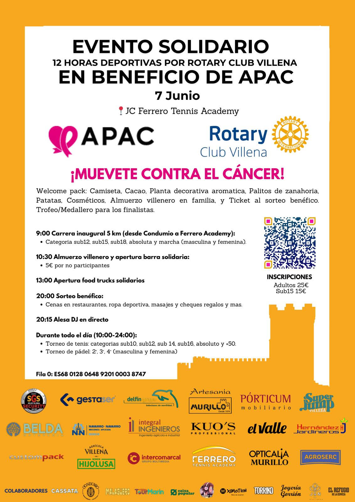 Además de las competiciones deportivas, durante todo el día el ambiente estará amenizado por el DJ Alesa, y se instalarán foodtrucks para ofrecer propuestas gastronómicas a los asistentes. Como parte de la recaudación solidaria, se realizará un sorteo benéfico con regalos aportados por los comercios locales de Villena. Para quienes no puedan asistir pero deseen colaborar, se ha habilitado una Fila 0 solidaria.
