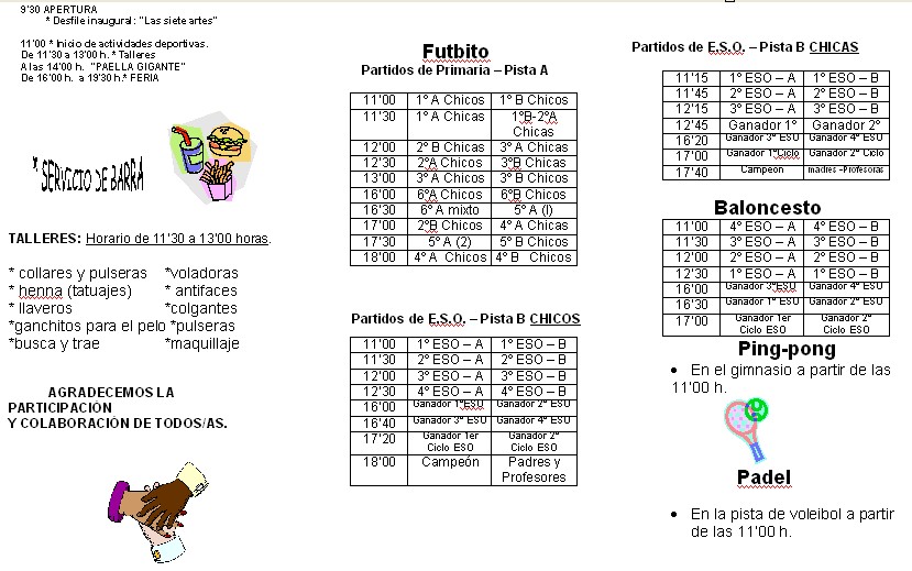 930 APERTURA * Desfile inaugural: Las siete artes 1100 * Inicio de actividades deportivas.De 1130 a 1300 h. * TalleresA las 1400 h. PAELLA GIGANTEDe 1600 h. a 1930 h.* FERIA