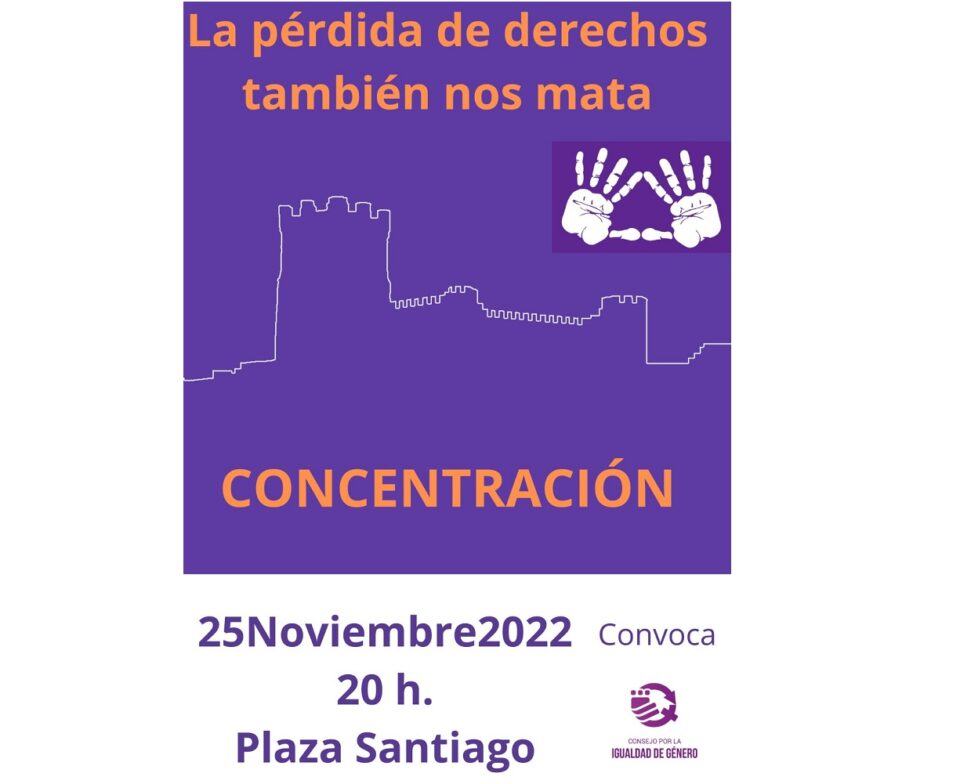 Villena, 24 de noviembre de 2022.- El Consejo por la Igualdad de Género ha convocado a la sociedad villenense a participar en la concentración con motivo del 25 de noviembre, Día Internacional de la eliminación de la violencia contra las mujeres, organizada para mañana viernes, a las 20.00 horas en la Plaza de Santiago, bajo el lema ‘La pérdida de derechos también nos mata’.