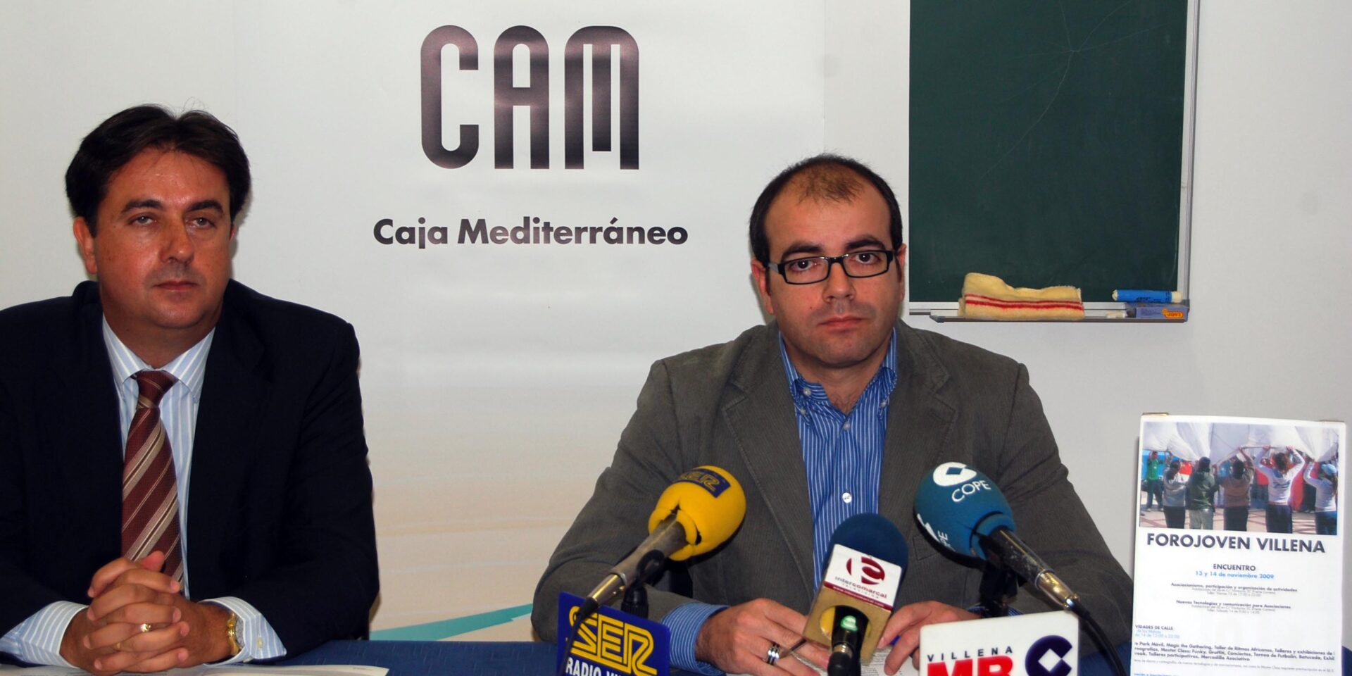 El edil de Juventud, José Joaquín Valiente y Carlos Montiel, Director de Zona de Caja Mediterráneo, han presentado esta mañana en las instalaciones de la Sede Universitaria de Villena, el Encuentro denominado Foro Joven Villena, que tendrá lugar en la capital del Alto Vinalopó el próximo fin de semana, a través de un gran programa de actividades de calle en la Plaza de Las Malvas.