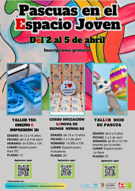 El programa de Pascua contará con un taller de pascua para edades comprendidas entre los 6 y 9 años. Será del 2 al 5 de abril, de 9:00 a 13.15 horas y tendrá 50 plazas. Taller de lengua de signos de 10 a 13 años, será del 2 al 5 de abril, de 10.30 a 13:00 horas con 20 plazas. Por último, habrá un taller de diseño e impresión en 3D, del 2 al 4 de abril, para jóvenes de 12 a 16 años en horario de 9.30 a 13:00 horas.