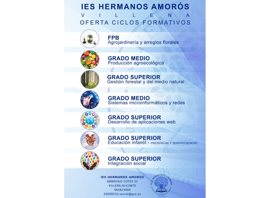 Desde el IES Hermanos Amorós informamos a la ciudadanía de Villena y comarca que para el próximo curso amplía su familia de ciclos formativos.