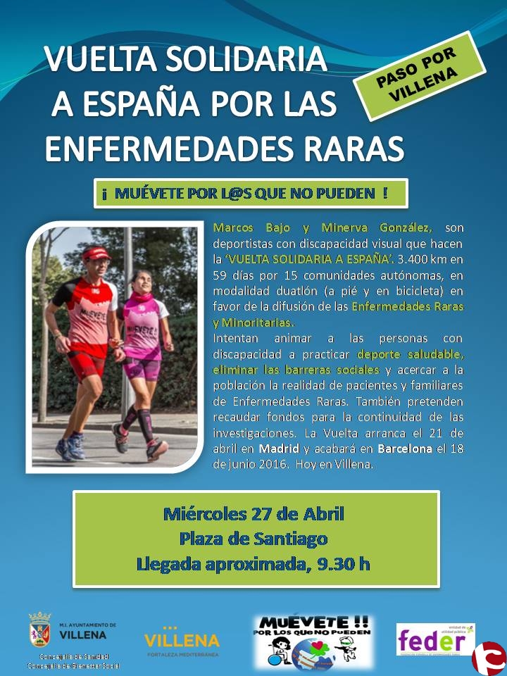 Villena acoge el miércoles 27 de abril, una de las etapas de la vuelta solidaria por las enfermedades raras a las 9.30 h en la Plaza de Santiago, dentro del Proyecto de difusión.