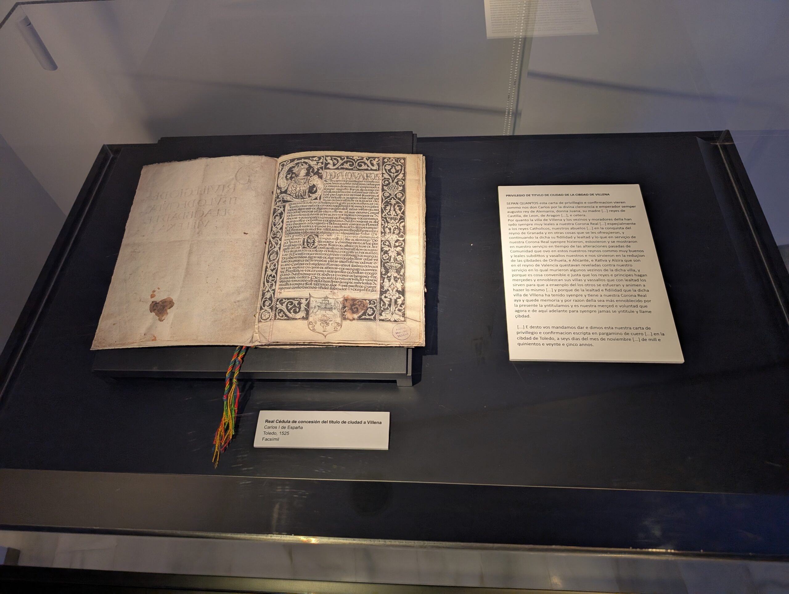 Junto a la proyección del documental, los visitantes podrán admirar un facsímil de la Carta de Privilegio y Confirmación del Título de Ciudad, otorgada a Villena el 6 de noviembre de 1525 en Toledo por el emperador Carlos I y su madre, la reina Juana I.