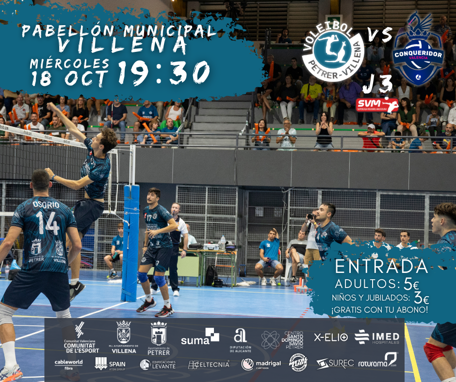 Este miércoles 18 de Octubre, Voleibol Villena-Petrer disputa la 3ª Jornada de la SUPERLIGA Masculina de Voleibol. Jornada especial porque es el derby de la Comunidad Valenciana en la Primera División, ya que nos visita Leleman Conqueridor Valencia. También, destacamos el estreno del Pabellón Municipal de Villena albergando por primera vez un partido de la máxima categoría como es la Superliga. Animamos a toda la afición y seguidores del deporte de Villena que se acerquen para disfrutar del gran nivel que se da en la pista en un partido de dicha categoría.