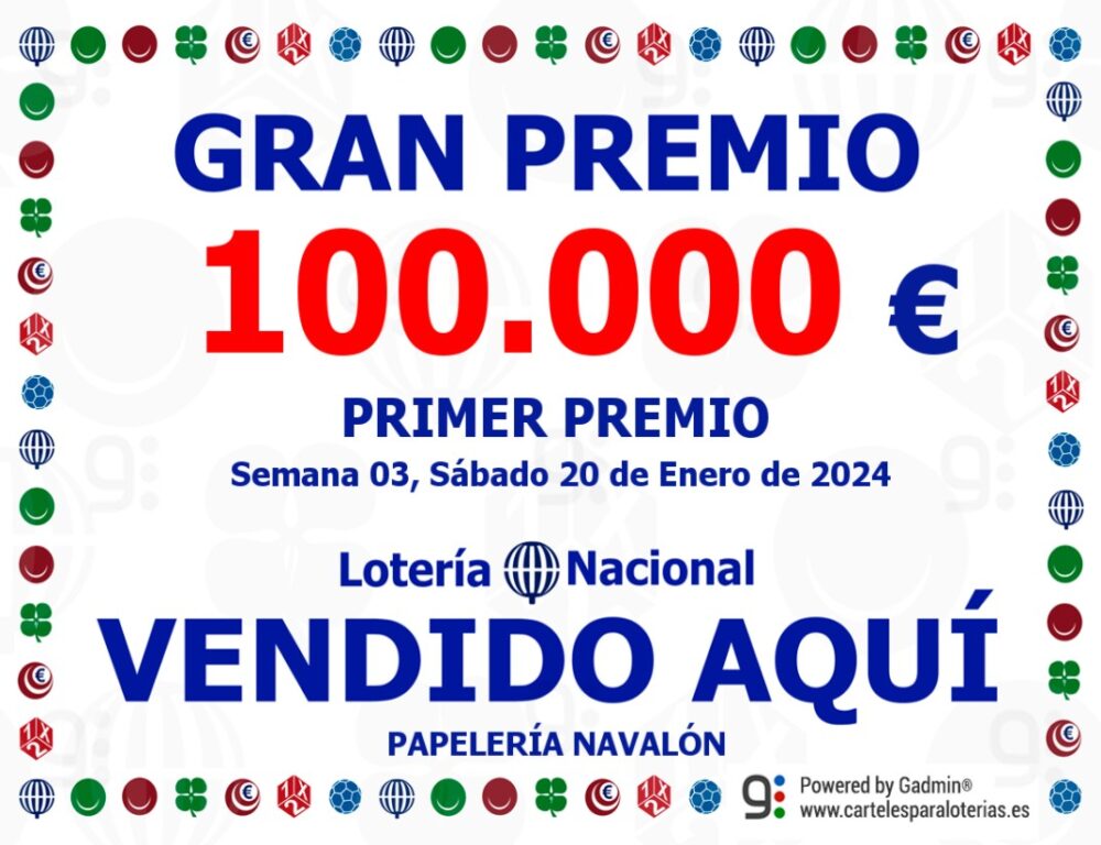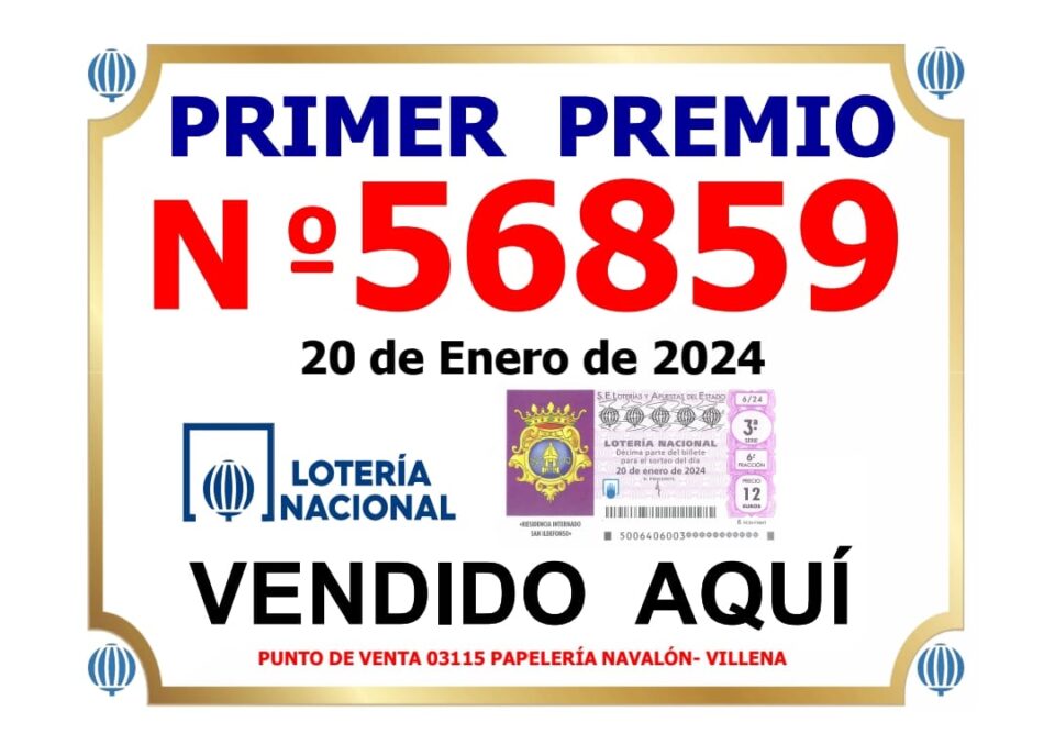 La Papelería Navalón de Villena, en Calle Joaquín María López número 26, ha vendido hoy sábado el primer premio de la Lotería Nacional del Sorteo Especial «Niños San Ildefonso». El primer premio, que ha sido para el número 56859 está dotado con 100.000 € al décimo, según informan desde la propia administración.