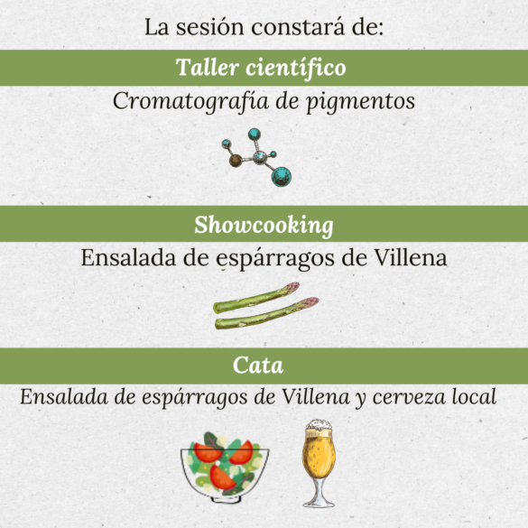 La edición de Gastrociencia tendrá lugar el próximo 28 de marzo, de 20.00 a 21.30 horas, y requiere una inscripción previa a través de las redes sociales del Gabinete o de la empresa organizadora, Metatemático. El taller, que consta de tres partes, se inicia con la práctica científica consistente en la extracción mediante cromatografía de los pigmentos presentes en diferentes variedades de espárragos de Villena. Seguidamente, se realizará un showcooking, donde se elaborará una ensalada de espárragos de Villena con burrata, tomate seco y polvos de quicos. Y, finalmente, se podrá catar la elaboración junto a muestras de espárrago en crudo que permitirá degustar las diferencias organolépticas de los cultivados en Villena, acompañada de cerveza artesana local.