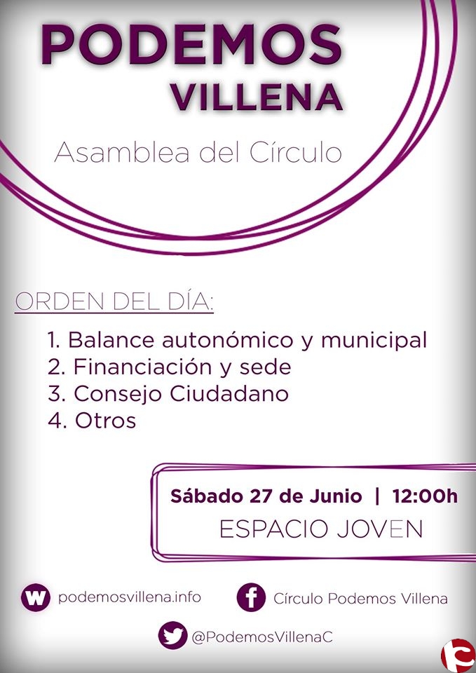 El próximo 27 de junio tendrá lugar una nueva asamblea del Círculo de Podemos Villena. La actividad tendrá lugar en el Espacio Joven a las doce del mediodía. La convocatoria tendrá como puntos principales el balance de los resultados de las pasadas elecciones, la búsqueda y puesta en común de medidas de financiación que nos permitan tener nuestra propia sede e informaremos sobre los cambios producidos en el Consejo Ciudadano.