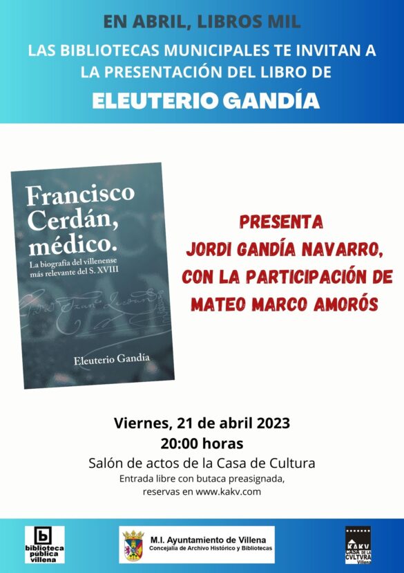 Por la tarde, y tal como destacó la edil, tendrá lugar la presentación del libro del autor Eleuterio Gandía, ‘Francisco Cerdán. Médico’, programado para el próximo viernes 21 de abril a las 20.00 horas en la Casa de la Cultura. “Y cuya recaudación será destinada a la entidad sin ánimo de lucro AMIF, lo que debe ser un motivo más para participar en esta actividad cultural y social”, ha añadido la concejala. Al respecto, el director de las Bibliotecas señaló que este es el primer libro que edita las Bibliotecas de Villena.