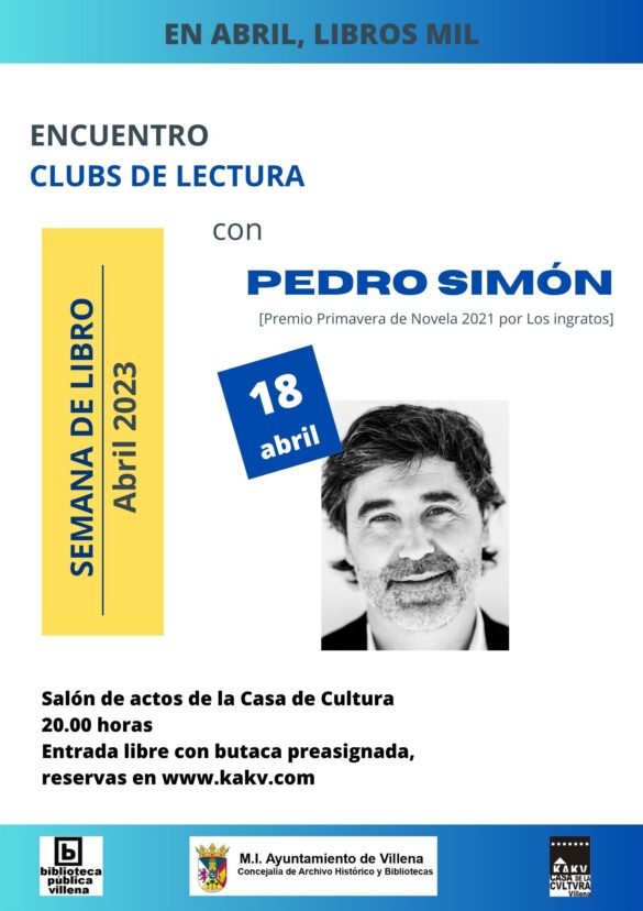 La programación vinculada al Día Internacional de Libro comienza el martes 18 de abril con el encuentro de los clubes de lectura de Pinoso, Monóvar, la Sede Universitaria de Villena y de la Biblioteca con el escritor y periodista Pedro Simón, en la KAKV a las 20.00 horas.