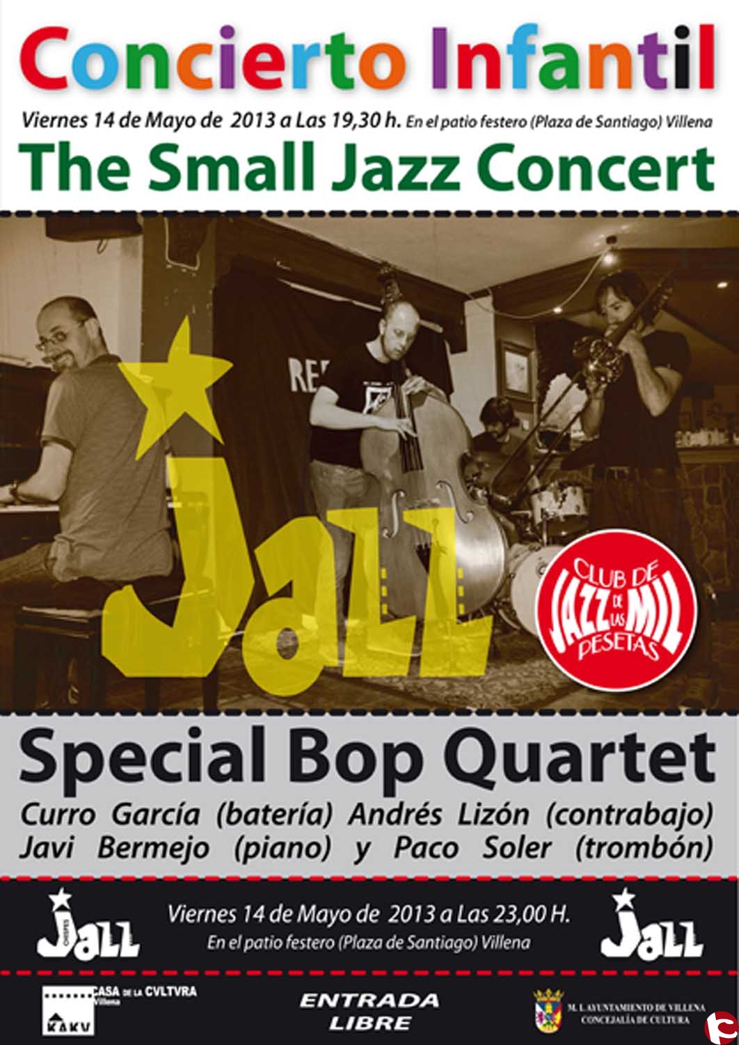 El viernes, 14 de mayo, El Club de Las Mil Pesetas, organiza en el Patio Festero (Plaza de Santiago) a las 19.30 horas, el Concierto Infantil The Small Jazz Concert. La entrada es libre. ¡No te lo pierdas!