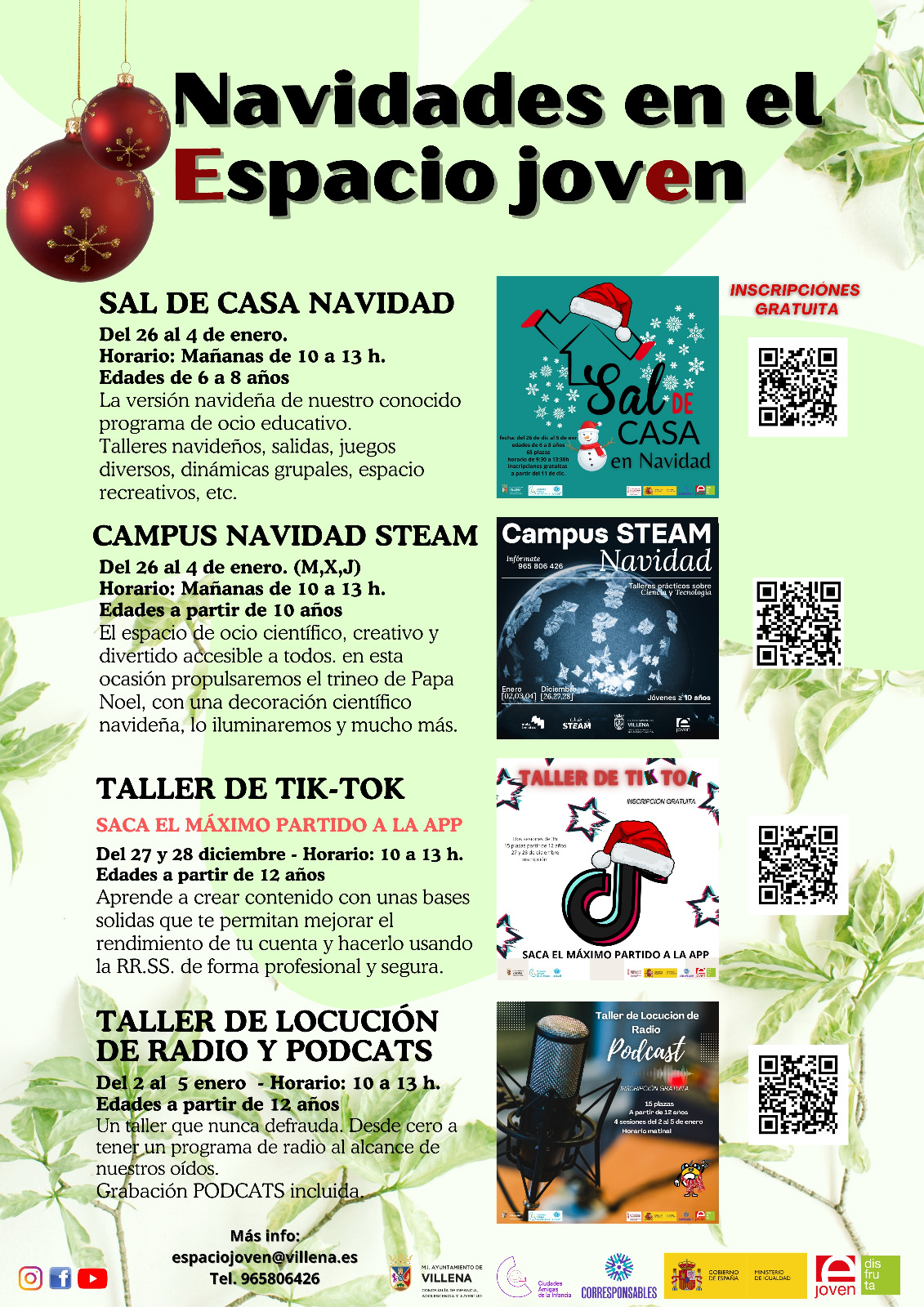 Espacio Joven tiene para los más mayores de 12 años un curso de tres horas por cada una de las dos sesiones, el 27 y el 28 de diciembre, sobre TikTok y como hacer un uso responsable de las redes sociales, así como técnicas para mejorar los contenidos. Finalmente, se ha ofertado un taller de locución de radio y postcad, también para adolescentes mayores de 12 años, que se realizará en cuatro sesiones entre el 2 y el 5 de enero.