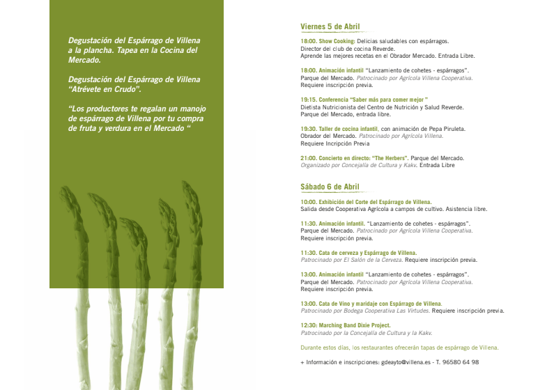 A las 19:15 horas tiene lugar “Saber más para comer mejor”, una conferencia a cargo de la dietista y nutricionista del Centro de Nutrición y Salud Reverde. La jornada del viernes culmina con el concierto en directo de “The Herbers” a partir de las 21 horas. “Las actividades se organizan en el Mercado ya que queremos que sea un referente como lugar para comprar el espárrago de Villena”, ha destacado la edil.
