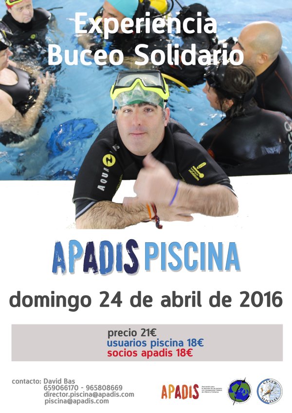 El precio de la jornada, que incluye clases teóricas e inmersión en la piscina es de 18 euros para socios de Apadis y usuarios de la piscina y 21 euros para el público en general, pudiendo participar niños a partir de 10 años de edad.