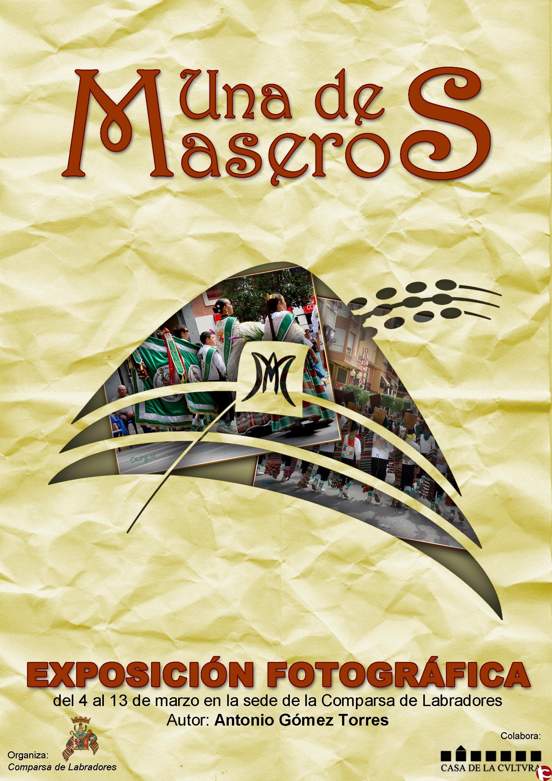 Nos encontramos a las puertas de la celebración de nuestro Ecuador Festero 2011. Nuestra comparsa se suma a esta celebración con los tradicionales actos que llevamos a cabo año tras año, añadiendo a los mismos una exposición fotográfica que esperamos sea del agrado de los que la visiten. Esta exposición ha sido organizada por nuestra comparsa con la colaboración de la Casa de Cultura de nuestra ciudad. El autor de la misma es el reconocido festero villenense Antonio Gómez Torres, quien de manera desinteresada ha aportado gran cantidad de material fotográfico a nuestro archivo durante los últimos años. Podemos verlo en innumerables actos de nuestra ciudad recogiendo instantáneas y de todas ellas ha realizado una interesante selección de imágenes relacionadas con los maseros. La tónica predominante en todas ellas es la espontaneidad y captación del instante, prescindiendo de preparación o anticipación del momento a retratar. Surge pues de esta exposición un reflejo del día a día de nuestra comparsa, una estampa de momentos cotidianos que quedarían en el olvido si no fuera por la presencia de fotógrafos como Antonio que hacen de su hobby un placer a nuestros sentidos.