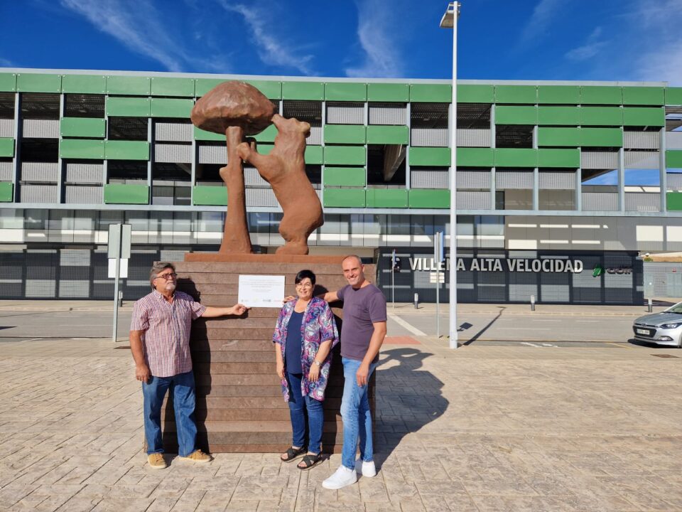 Esta figura se compone por una peana realizada en madera plástica reciclada que da soporte a la escultura realizada en fibra de vidrio junto a una placa explicativa del porqué de esta figura en la explanada de entrada a la estación de Villena.