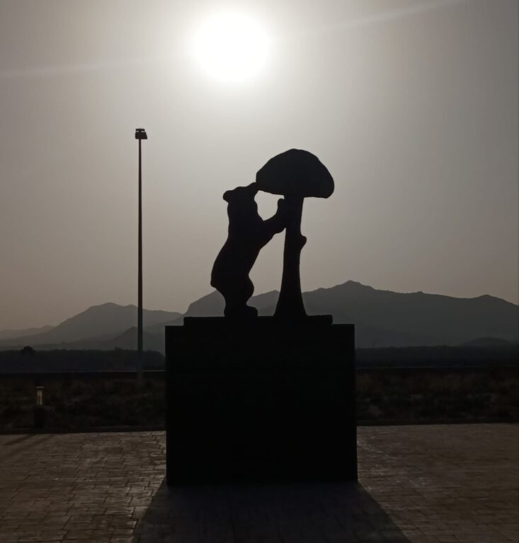 Villena, 30 de agosto de 2023.- La estación de AVE de Villena da la bienvenida a los viajeros con una réplica de la conocida escultura del oso y el madroño, una instalación que finalizó ayer por completo, aunque hace unas semanas que ya estaba en la estación.